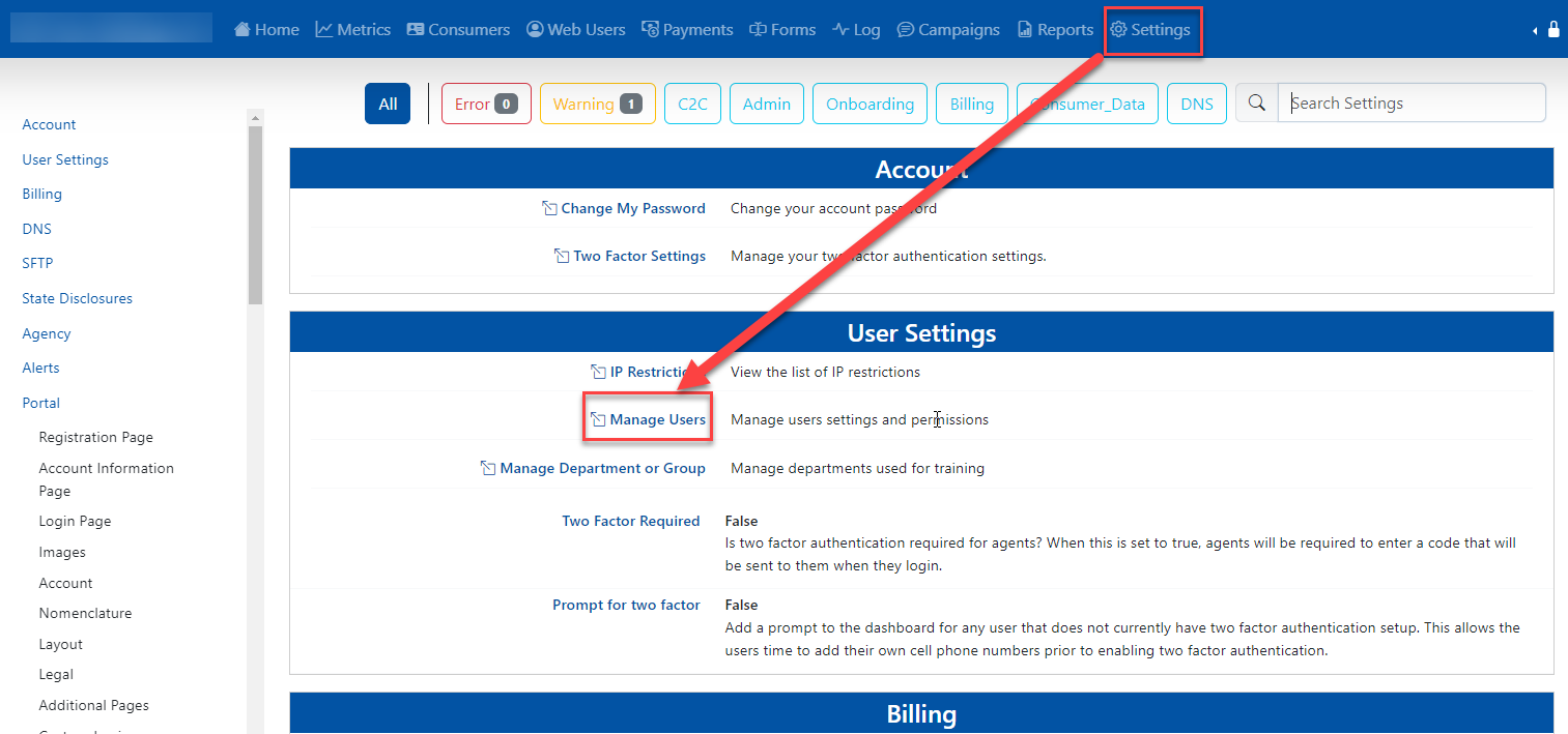 - Click the Settings tab from the main menu then under the User Settings click Manage Users.