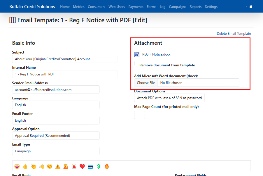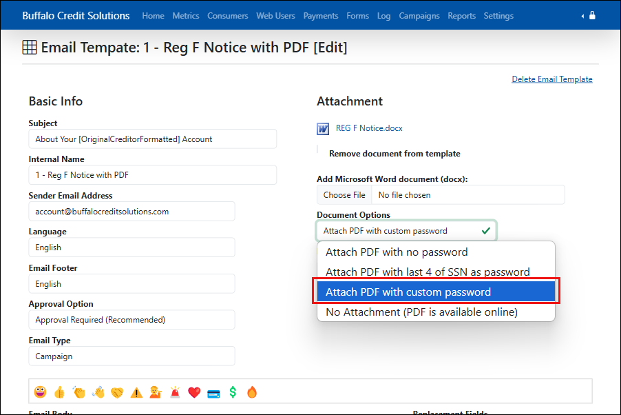 The Attach PDF with Custom Password requires that your system provide a custom password. The manner in which this is does depends on how your data is integrated or uploaded. When first utilizing this feature, contact Concepts2Code technical support. Once it is setup, follow the below steps to utilize this feature with email and letter campaigns.
