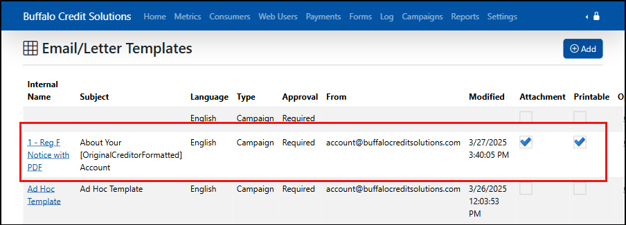 Select the template you wish to adjust by clicking on the Internal Name from the list.