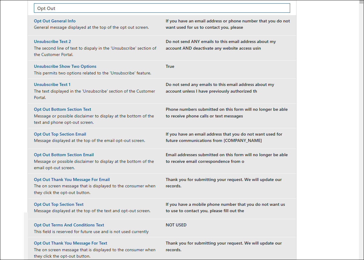 The Opt-Out page is fully configurable based on your business needs. You can configure the text displayed for the general instructions and each of the primary forms of communication, email or text/phone, by using the Opt-Out Settings located on the Admin Settings page.